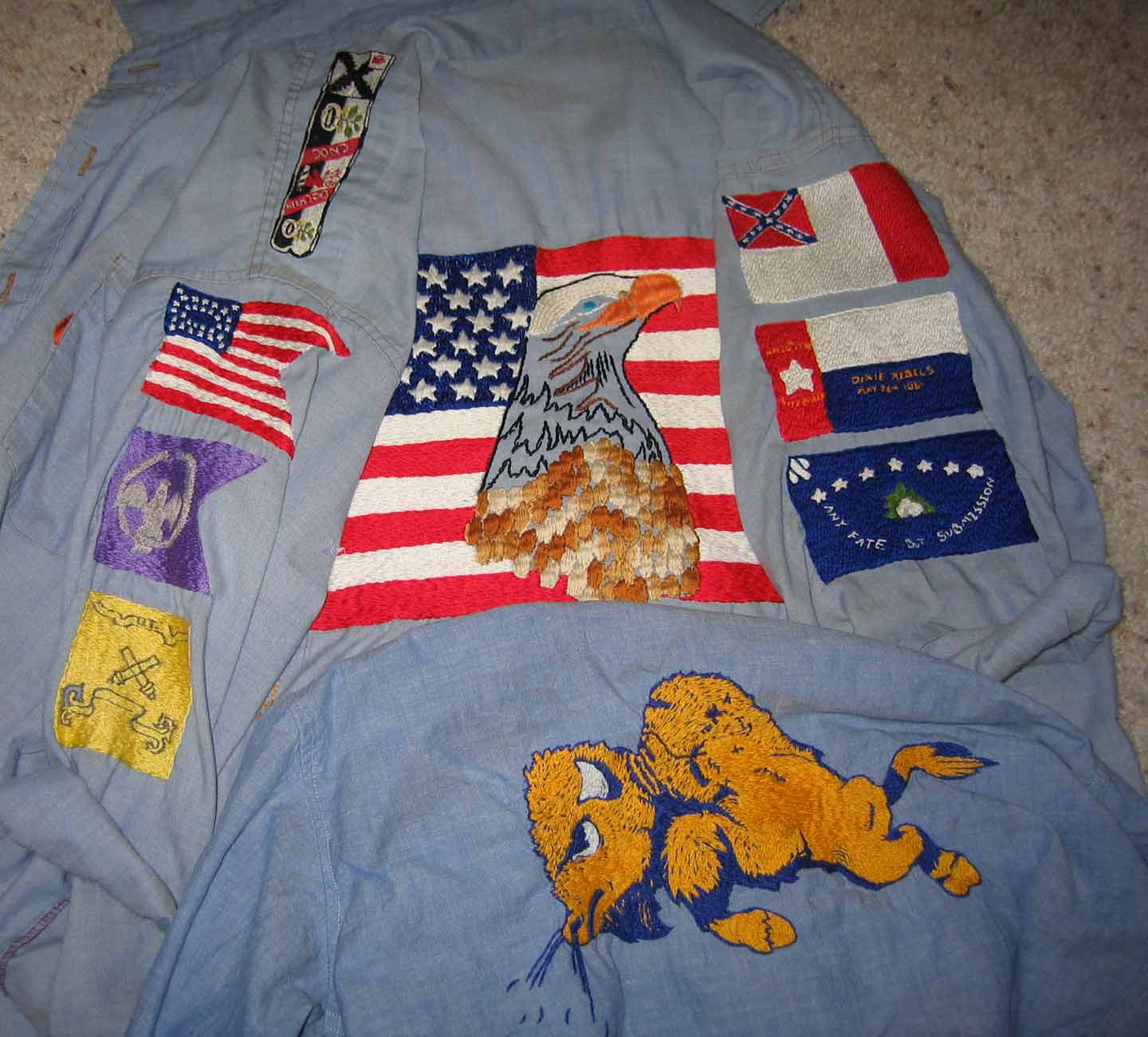 Misc For high school, I went to a private school in England. During my travels I was spit on, cursed at, and pee-d on for being American. I embroidered the top shirt to bolster my teenage resolve and give them a better target. The sleeves reflect flags of the Yanks, and Johnny Rebs, since my family fought on both sides of the Civil War. The shoulder design is for my clan, Colquhoun. The lower image is my college mascot. They changed the colors just after I finished embroidering the design. Jerks! Image. |